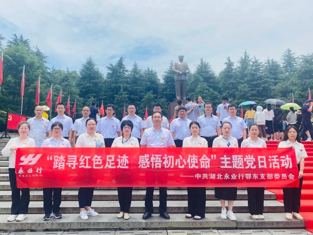 为庆祝中国共产党成立102周年,6月10-11日,中共湖北永业行鄂东党支部(下称“鄂东党支部”)组织全体党员、入党积极分子、管理团队等近20人赴湖南长沙、韶山开展“踏寻红色足迹,感悟初心使命”主题党日活动,通过缅怀伟人、重温入党誓词、参观纪念馆等形式,传承红色文化基因和革命精神,进一步坚定理想信念。 怀着对伟大领袖的无限敬仰和深切怀念之情,在永业行助理总裁、鄂东区总经理徐宇初的带领下,一行人到毛主席铜像广场,敬献花篮,鞠躬致敬。随后缓步绕行铜像一周,瞻仰伟人风范,缅怀领袖为人民谋幸福,为民族谋复兴的光辉一生。在伟人铜像下,由鄂东党支部书记魏晓红带领,全体党员庄严地